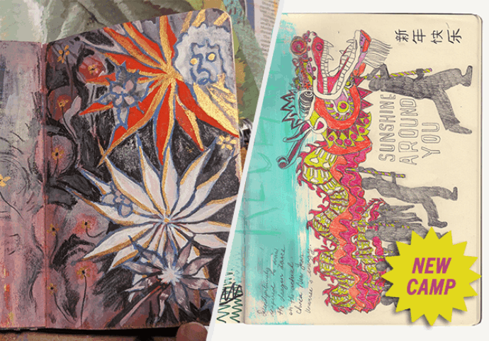Unleash your creativity in our Experimental Sketchbook Camp, where artists dive into mixed media and bold techniques to transform the traditional sketchbook into a multi-dimensional art experience. Through collaging, painting, drawing, cutting, and creative manipulation, students push past the flat page to craft a sketchbook that’s as dynamic as their imagination.